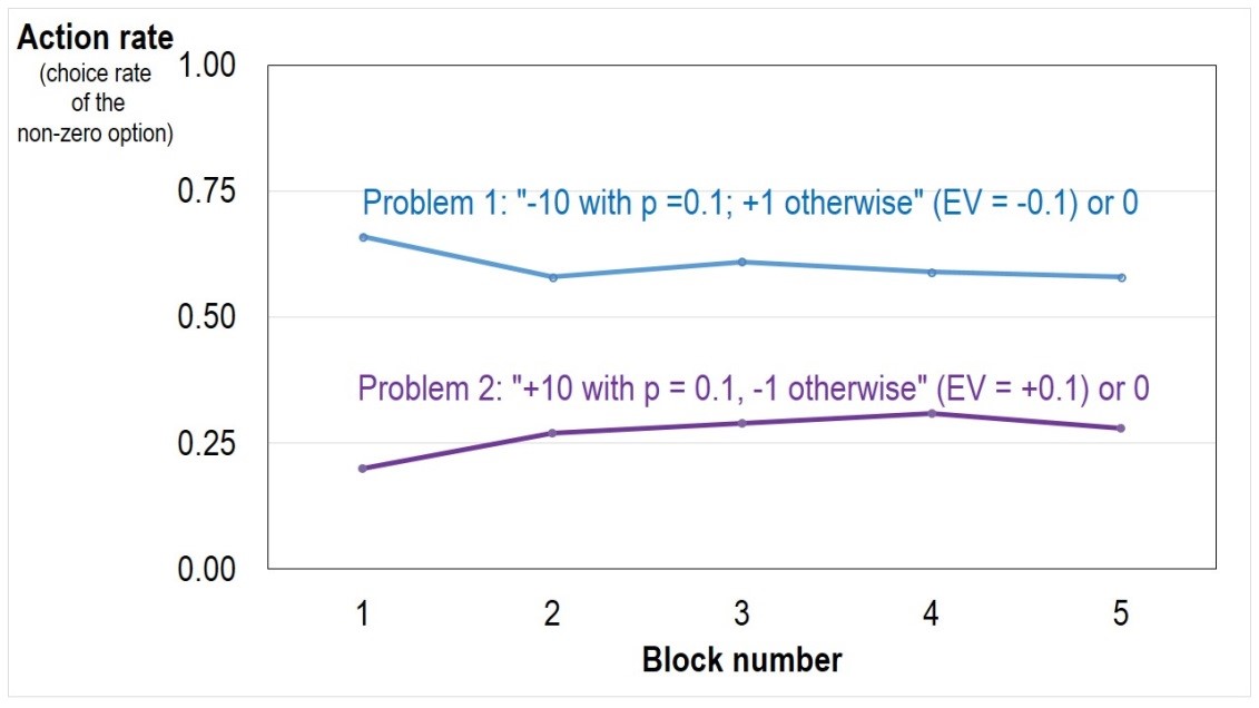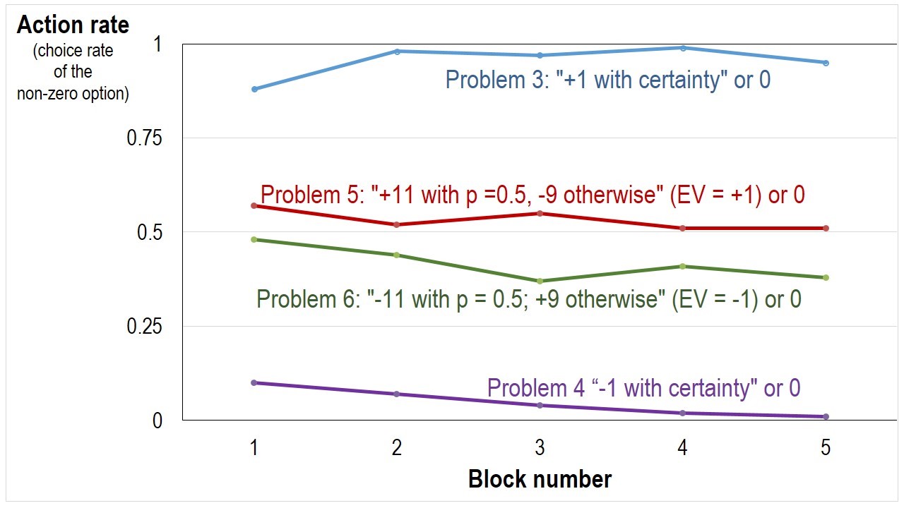 The two curves show the aggregated choice rate of the risky action in five blocks of 20 trials (Nevo & Erev, 2012; and Teodorescu et al., 2013; see Figure 2). The results reveal that the typical participant favoured the risky prospect when it impaired expected return (R-rate of 60% in Problem 1 when the EV of the risky prospect is -0.1), but not when it maximizes expected return (R-rate of 27% in Problem 2 when the EV of the risky prospect is +0.1). Thus, the typical results in both problems reflect deviation from maximization. The participants appear to be risk seekers in Problem 1, and risk averse in Problem 2. Another way of interpreting the data is that in both cases they reflect underweighting of rare events (see Barron & Erev, 2003). That is, the typical participant behaves “as if” he does not pay enough attention to the rare (10%) outcomes.