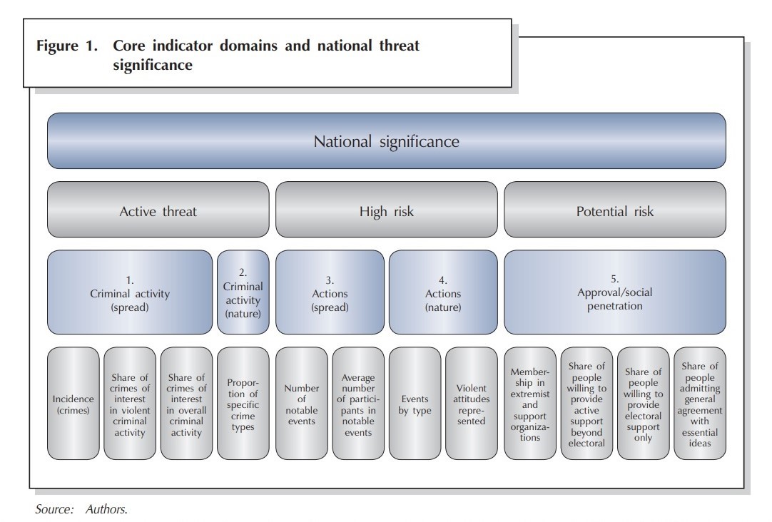 The report provides a methodology for the establishment of a viable mechanism for monitoring and assessment of the current state and developments over time in extremism-related acts and actors on the national level (Figure 1). The situational assessment includes 12 core indicators aimed at presenting the national threat picture, as well as subject-specific indicators providing more in-depth information on specific areas of interest.